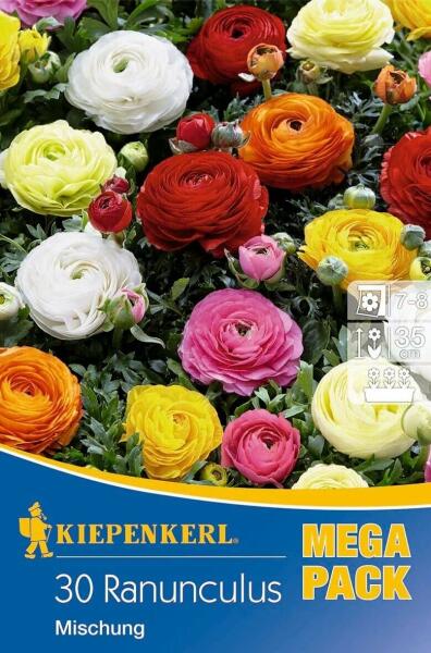 Ranunculus Ranunkelmischung vegyes ázsiai boglárka virághagyma összeállítás MEGA PACK Virághagyma körmérete: 5/7 cm Növény várható magassága: 35 cm Javasolt ültetési ideje: szeptember-december Virágzás ideje: július-augusztus Vágott virágnak is alkalmas Balkonládába is ültethetõ A Kiepenkerl 'Ranunkelmischung' vegyes ázsiai boglárka virághagyma csomag egy színes és e