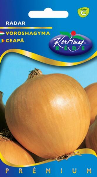 Rédei kertimag Radar vöröshagyma vetõmag C'Áttelelõ fajta. Enyhén csípõs ízű. Külsõ héj színe barna. Nehezen magzik fel. Vetési idõ: október Életcikus: , áttelelõ, Termés vagy virág színe: barna Növény magassága: 30 cm Tenyészidõ: középérésű Szedés vagy virágzás ideje: június Sortávolság: 30 cm Tõtávolság: 5 cm Vetésmélység: 1 cm Vetõmagigény: 8 g/10