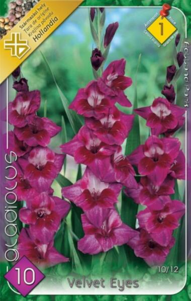 Gladiolus Velvet Eyes kardvirág virághagymák 1' Javasolt ültetési ideje: III. -V. Virágzás ideje: VII. -IX. Javasolt ültetési távolság: 10 cm Javasolt ültetési mélység kb. : 10 cm Növény várható magassága kb. : 90 cm Termesztett állományból származó növény. Származási hely: EUSzára nem ágazik el, hosszan barázdált levelet növeszt. Erõs száron lévõ virágai tö