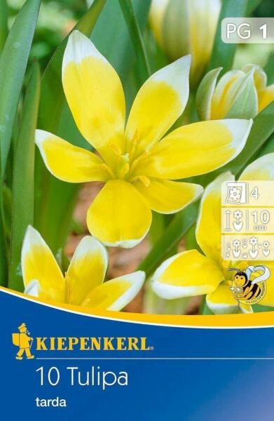 Tulipa tarda botanikai tulipán virághagymák Virághagyma körmérete: 7/+ cm Növény várható magassága: 10 cm Javasolt ültetési ideje: szeptember-december Virágzás ideje: április-május Balkonládába is ültethetõ A botanikai tulipánok kisebb méretűek és természetes formájukban nõnek, közelebb állnak vadon élõ rokonaikhoz. Ezek a tulipánok ideálisak sziklakertbe, elõker