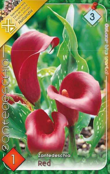 Piros kála, tölcsérvirág Javasolt ültetési ideje: IV. -VI. Virágzás ideje: VII. -IX. Javasolt ültetési távolság: 20 cm Javasolt ültetési mélység kb. : 10 cm Növény várható magassága kb. : 40 cm Termesztett állományból származó növény. Származási hely: EUFényigényes, napsütéses helyet kedvel, árnyékban a virágai nem fejlõdnek szépen. A nagyon meleg nyári napo