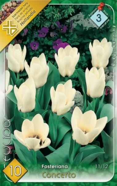 Tulipa Fosteriana concerto tulipán virághagymák Virághagyma körmérete: 10/12 cm Javasolt ültetési ideje: Szeptember - December Virágzás ideje: Április Javasolt ültetési távolság: kb. : 10 cm Javasolt ültetési mélység kb. : 10 cm Növény várható magassága kb. : 30 cm A Fosteriana tulipánok botanikai tulipánok. Mintegy 30 cm-es virágszárral, hosszan tartó, különleges sz