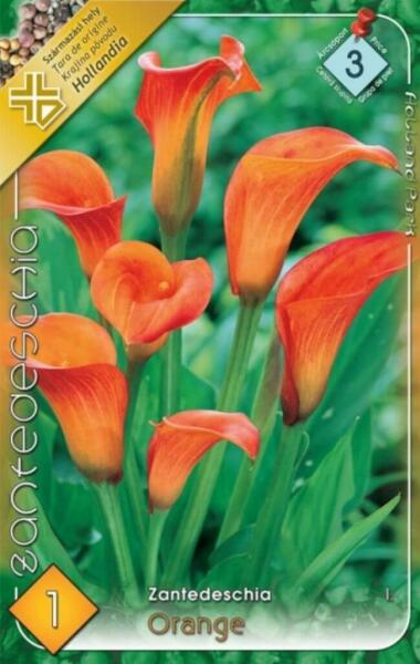 Zantedeschia Orange narancs kála, tölcsérvirág virághagyma Javasolt ültetési ideje: IV. -VI. Virágzás ideje: VII. -IX. Javasolt ültetési távolság: 20 cm Javasolt ültetési mélység kb. : 10 cm Növény várható magassága kb. : 40 cm Termesztett állományból származó növény. Származási hely: EUFényigényes, napsütéses helyet kedvel, árnyékban a virágai nem fejlõdnek