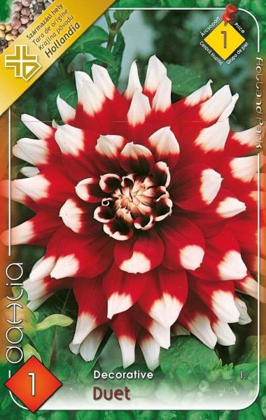 Duet dekoratív dália Javasolt ültetési ideje: III. -V. Virágzás ideje: VII. -X. Javasolt ültetési távolság: 60 cm Javasolt ültetési mélység kb. : 8 cm Növény várható magassága kb. : 110 cm Termesztett állományból származó növény. Származási hely: EU Kiültetés elõtt a gumókat - megjelölve, hogy melyik-melyik - virágzás segítõként és hajtásdugványozással tö