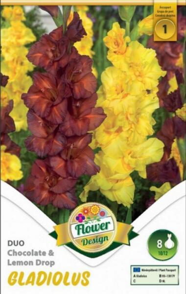 Gladiolus Duo Chocolate & Lemon Drop kardvirág virághagymák 1' Javasolt ültetési ideje: III. -V. Virágzás ideje: VII. -IX. Javasolt ültetési távolság: 10 cm Javasolt ültetési mélység kb. : 10 cm Növény várható magassága kb. : 90 cm Termesztett állományból származó növény. Származási hely: EUSzára nem ágazik el, hosszan barázdált levelet növeszt. Erõs száron