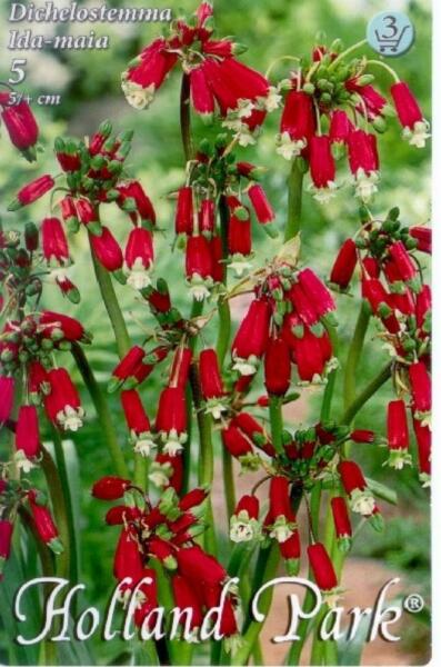 Dichelostemma Ida-maia petárda virág virághagymák Virághagyma körmérete: 5/+ cm Javasolt ültetési ideje: IX. -XII. Virágzás ideje: VII. -VIII. Javasolt ültetési távolság kb. : 5-8 cm Javasolt ültetési mélység kb. : 20 cm Növény várható magassága kb. : 60-90 cm A petárda virág számtalan csõ alakú, sárga szegélyű piros virágjával a kert különleges dísze. Vágott