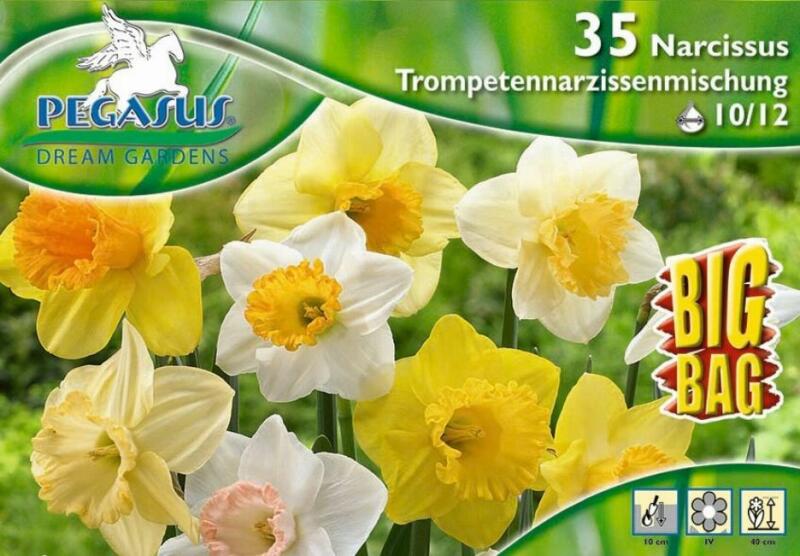 Narcissus Trompeten-Narzissenmischung vegyes trombitavirágú nárcisz virághagymák BIG BAG Virághagyma körmérete: 10/12 cm Növény várható magassága: 40 cm Javasolt ültetési ideje: szeptember-december Virágzás ideje: április Vágott virágnak is alkalmas A Pegasus nárcisz (Narcissus 'Trompeten-Narzissenmischung') egy lenyűgözõ, vegyes virághagymából származó nárciszfajta.