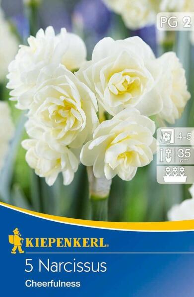 Narcissus Cheerfulness teltvirágú nárcisz virághagymák Virághagyma körmérete: 12/14 cm Növény várható magassága: 35 cm Javasolt ültetési ideje: szeptember-december Virágzás ideje: április-május Vágott virágnak is alkalmas Balkonládába is ültethetõ Illatos A teltvirágú nárciszok különlegesen szép és elegáns virágok, melyek tömött, réteges szirmokkal rendelkeznek