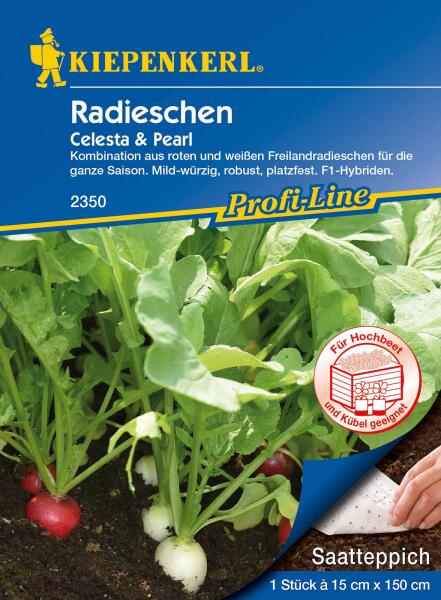 Kiepenkerl Celesta+Pearl Retek vetõmagszõnyeg vetõmag Vetés: márc-szept. (szabadföld) / 0,5-1 cm mélyen Csírázás: 8-14 nap 6-20°C Tõ- és sortáv: vetõmagszõnyeg, ritkítás nem szükséges Szedés: máj-nov. Hónapos retek színösszeállítás piros ('Celesta') és fehér ('Pearl') F1-hibrid fajtákból. A piros fajta robusztus, gyors fejlõdésű, sokáig szedhetõ, kerek, repe