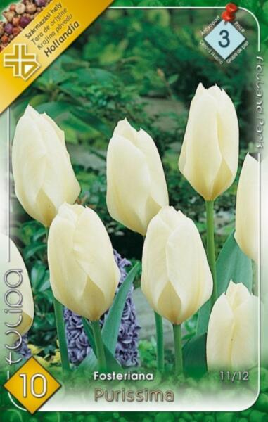 Tulipa Fosteriana Purissima Tulipán virághagymák Javasolt ültetési ideje: Szeptember- December Virágzás ideje: Április Javasolt ültetési távolság: 10 cm Javasolt ültetési mélység kb. : 10 cm Növény várható magassága kb. : 45 cm Termesztett állományból származó növény. Származási hely: EU A Fosteriana tulipánok botanikai tulipánok. , mintegy 30 cm-es virágszárral,