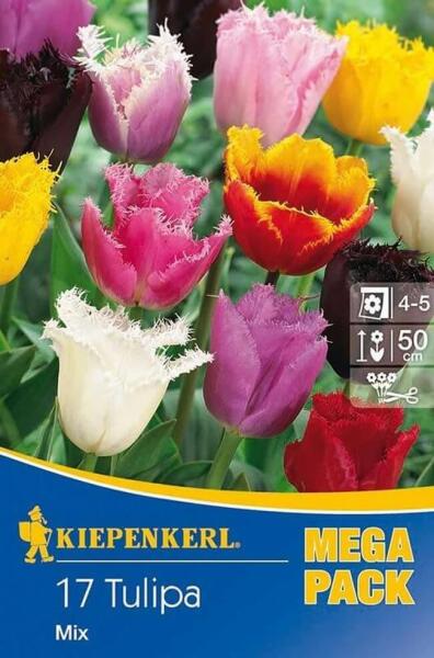 Tulipa Gefranste Tulpen vegyes rojtosvirágú tulipán virághagymák MEGA PACK Virághagyma körmérete: 11/12 cm Növény várható magassága: 30-60 cm Javasolt ültetési ideje: szeptember-december Virágzás ideje: május Vágott virágnak is alkalmas A Kiepenkerl fodros tulipánkeveréke egy egyedülálló válogatás tulipánhagymákból, amelyek sokszínűségükkel és szépségükkel gaz