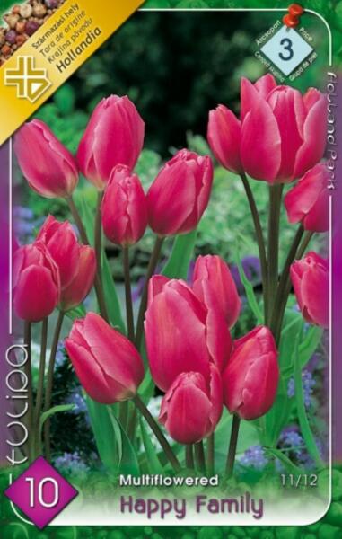Tulipa Multiflowered Happy Family Tulipán virághagymák Virághagyma körmérete: 11/12 cm Javasolt ültetési ideje: Szeptember - December Virágzás ideje: Április Javasolt ültetési távolság: 10 cm Javasolt ültetési mélység kb. : 10 cm Növény várható magassága kb. : 50 cm A csokros tulipánok 50 cm szárhosszúságú igen hosszan virágzó, különleges tulipánok. Egy száron t