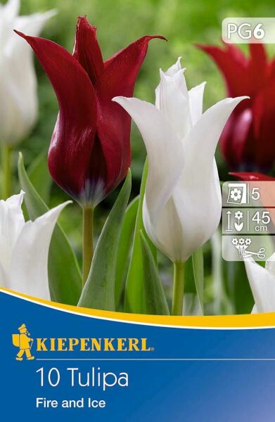 Tulipa Fire and Ice liliomvirágú tulipán virághagymák Virághagyma körmérete: 11/12 cm Növény várható magassága: 45 cm Javasolt ültetési ideje: szeptember-december Virágzás ideje: május Vágott virágnak is alkalmas A liliomvirágú tulipánok a tavaszi kertek elegáns és kifinomult virágai, amelyek karcsú, liliomszerű virágformájukkal különböztetik meg magukat. Hosszú,