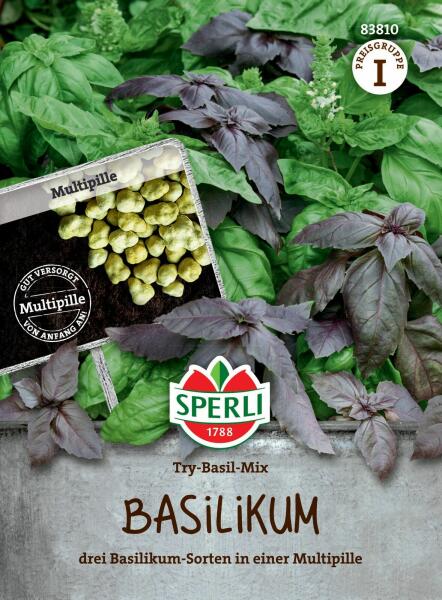 Sperli Try-Basil-Mix bazsalikom-trió drazsírozott vetõmag (3 fajta egyben) vetõmag "Háromféle bazsalikomfajta egyetlen multidrazséban, ez a ""Try Basil Mix"" különlegessége. Három különbözõ bazsalikomfajta magja kerül egy drazséba. A három fajta különbözõ levélformájú és színű. Található benne egy Genovese típusú bazsalikom, egy fogazott levélszélű Serrata típus