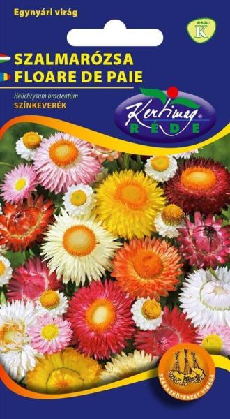 Rédei kertimag szalmarózsa színkeverék vetõmag K'A legkeresettebb szárazkötészeti virág. A hajtások végén hozza élénk színű virágait. A virágokat félig nyílt állapotban szedjük és árnyékos helyen, lógatva szárítjuk. Vetési idõ: március Palántázás ideje: május Életcikus: , egynyári, Termés vagy virág színe: színkeverék Növény magassága: 70 cm Szedés vag
