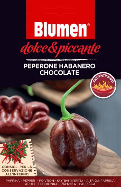 Peperone Habanero Chocolate, extrém csípõs csokoládé habanero chili paprika Nagyon ellenálló fajta. Termése 2-8cm-re nõ meg. Edénybe is vethetõ. Napigényes. Javasolt vetési hõmérséklet: 20/30 °C. Szabadföldbe, és fóliasátorba is vethetõ. 40 cm tõtávolságra, 1 cm mélyen vetendõ. Dupla védõcsomagolásban biztosítjuk a kiváló minõséget, s a garantált kikelést a 3 P