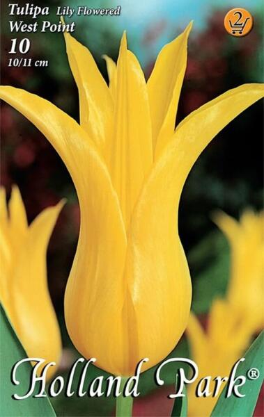 Tulipa Lily flowered West Point liliomvirágú tulipán virághagymák Virághagyma körmérete: 10/11 cm Javasolt ültetési ideje: IX. -XII. Virágzás ideje: IV. -V. Javasolt ültetési távolság kb. : 10 cm Javasolt ültetési mélység kb. : 10 cm Növény várható magassága kb. : 55 cm A liliomvirágú tulipánok április-májusban virágzó, rendkívül kecses virágformájú tulipánok.