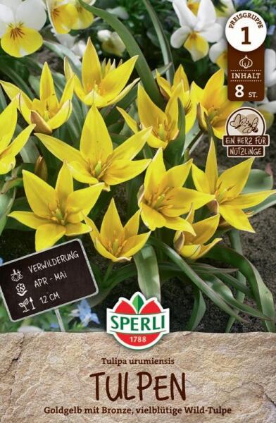 Wildtulpe urumiensis botanikai tulipán virághagyma Virághagyma körmérete: 11/12 cm Növény várható magassága: 30-60 cmJavasolt ültetési ideje: szeptember-decemberVirágzás ideje: március-májusVágott virágnak is alkalmas A botanikai tulipánok kisebb méretűek és természetes formájukban nõnek, közelebb állnak vadon élõ rokonaikhoz. Ezek a tulipánok ideálisak sziklakertbe,