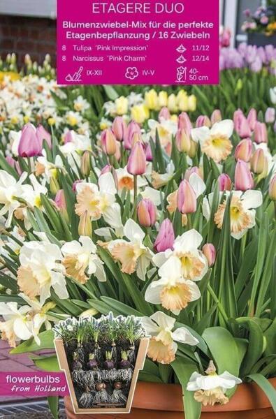 Etagere Duo virághagyma összeállítás Csomag tartalma: 8 db Narcissus Pink Charm 12/14 cm-es nárcisz virághagyma 8 db Tulipa Pink Impression 11/12 cm-es tulipán virághagyma Növények várható magassága: 40-50 cm Javasolt ültetési ideje: szeptember-december Virágzás ideje: április-május Balkonládába is ültethetõ A Young Generation Etagere "Duo" egy tulipánhagyma keverék, amel