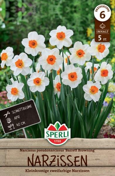 Kleinkronige Narzisse Barrett Browning kis koronájú nárcisz virághagyma Virághagyma körmérete: 12/14 cm Növény várható magassága: 20-40 cmJavasolt ültetési ideje: szeptember-decemberVirágzás ideje: március-áprilisVágott virágnak is alkalmasA kis koronájú nárcisz egy bájos és kompakt tavaszi virág, amely kis méretével és élénk színeivel tűnik ki. Fehér, sárga vagy