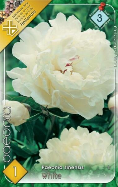 Paeonia Sinensis white bazsarózsa, pünkösdi rózsa virághagyma 3' Javasolt ültetési ideje: III. -IV. Virágzás ideje: V. -VII. Javasolt ültetési távolság: 35 cm Javasolt ültetési mélység kb. : 6 cm Növény várható magassága kb. : 100 cm Termesztett állományból származó növény. Származási hely: EU Ültetés tavasszal, tápanyagban gazdag, laza talajba, napos vagy félár
