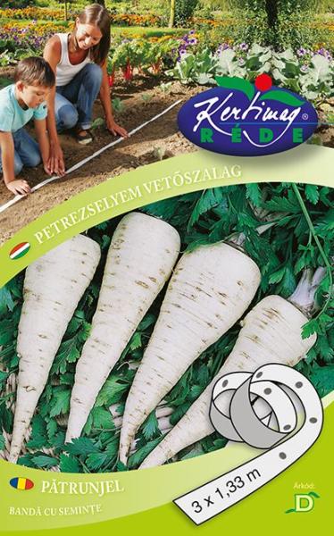 Rédei kertimag Hanácká petrezselyem vetõszalag 3x1,33 méter D'Vetõszalag használatával elkerüljük a ritkítás fáradtságos munkálatát. Gyors és egyszerű a veteményezés, a növények jobban fejlõdnek, a felhasznált környezetbarát papír lebomlik a talajban. Fajtajellemzõk: hosszú tenyészidejű, tárolásra kiválóan alkalmas félhosszú gyökérpetrezselyem. Gyökere nagyo