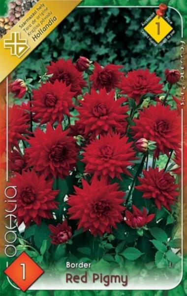 Dahlia Border Red Pigmy park dália gumó 1' Javasolt ültetési ideje: III. -V. Virágzás ideje: VII. -X. Javasolt ültetési távolság: 50 cm Javasolt ültetési mélység kb. : 8 cm Növény várható magassága kb. : 50 cm Termesztett állományból származó növény. Származási hely: EU Park Dália A jól ismert kaktusz és dekoratív dáliáknál alacsonyabb termetével (kb. 50 cm) alk