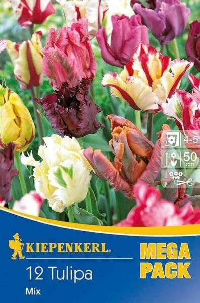 Tulipa Papagei Tulpen vegyes papagájvirágú tulipán virághagymák MEGA PACK Virághagyma körmérete: 11/12 cm Növény várható magassága: 35-55 cm Javasolt ültetési ideje: szeptember-december Virágzás ideje: május Vágott virágnak is alkalmas A Papagáj tulipán keverék mega-csomag minden tulipánrajongónak igazi kincs. A csomag 12 virághagymát tartalmaz, amelyekbõl tavasszal gy