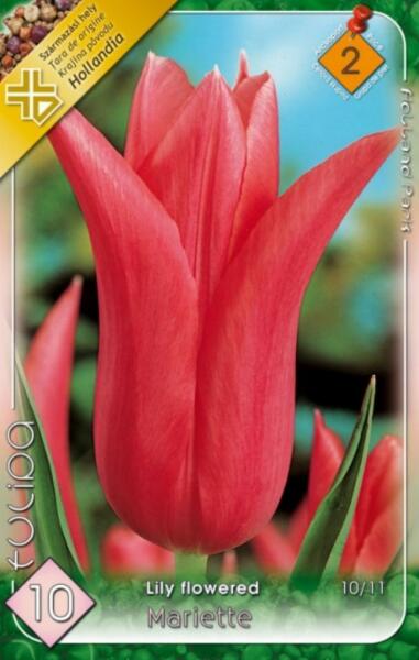 Tulipa Lily flowered Mariette tulipán virághagymák Virághagyma körmérete: 10/11 cm Javasolt ültetési ideje: Szeptember-December Virágzás ideje: Április-május Javasolt ültetési távolság: 10 cm Javasolt ültetési mélység kb. : 10 cm Növény várható magassága kb. : 55 cm Termesztett állományból származó növény. Származási hely: EU A liliomvirágú tulipánok április-m