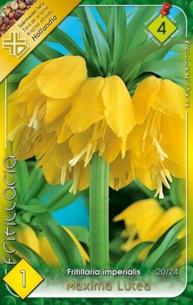 Fritillaria Imperialis Maxima Lutea Császárkorona virághagyma Virághagyma körmérete: 20/24 cm Javasolt ültetési ideje: VIII. -XII. Virágzás ideje: IV. -V. Javasolt ültetési távolság: 20 cm Javasolt ültetési mélység kb. : 15 cm Növény várható magassága kb. : 90 cm A császárkorona a tavaszi kert különleges dísze. 80 cm-es magasságával elegáns szoliter növény. Jellegz