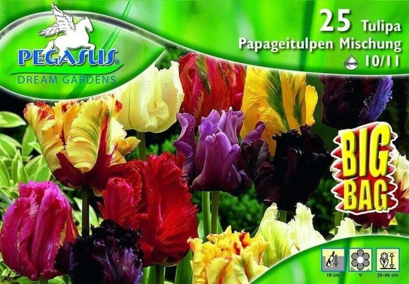 Tulipa Papageitulpen Mischung vegyes papagájvirágú tulipán virághagymák BIG BAG Virághagyma körmérete: 10/11 cm Növény várható magassága: 25 cm Javasolt ültetési ideje: szeptember-december Virágzás ideje: április Balkonládába is ültethetõ A Pegasus 'Papgeitulpen Mischung' vegyes tulipán virághagyma csomag egy színes és változatos keveréket tartalmaz, amely különböz