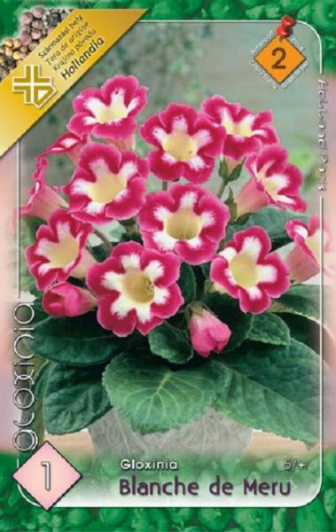 Gloxinia Blanche de Meru gloxínia gumók 2' Virághagyma mérete: 5/+ cm Növény várható magassága kb. : 25 cm Termesztett állományból származó növény. Származási hely: EUA gloxínia Brazíliából származó hagymás évelõ növény. Kis termetével és feltűnõ virágzatával lopta be magát a kertészek szívébe. Fodros szélű, tölcsérre emlékeztetõ színes virágai egész