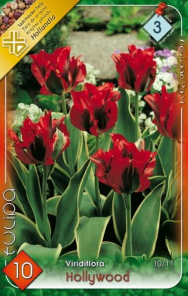 Tulipa Viridiflora Hollywood Tulipán virághagymák Javasolt ültetési ideje: Szeptember- December Virágzás ideje: Április Javasolt ültetési távolság: 10 cm Javasolt ültetési mélység kb. : 10 cm Növény várható magassága kb. : 50 cm Termesztett állományból származó növény. Származási hely: EU A Viridiflora tulipánok 50 cm szárhosszúságú különösen szép színű tul