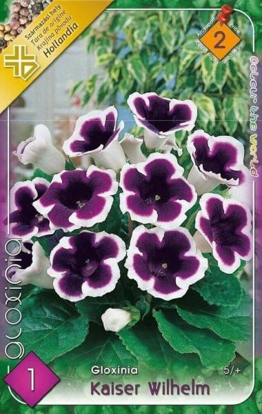 Kaiser Wilhelm gloxínia Virághagyma mérete: 5/+ cm Növény várható magassága kb. : 25 cm Termesztett állományból származó növény. Származási hely: EUA gloxínia Brazíliából származó hagymás évelõ növény. Kis termetével és feltűnõ virágzatával lopta be magát a kertészek szívébe. Fodros szélű, tölcsérre emlékeztetõ színes virágai egész nyáron virágoznak