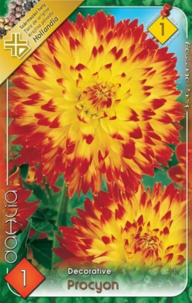 Dahlia Decorative Procyon dekoratív dália gumó 1' Javasolt ültetési ideje: III. -V. Virágzás ideje: VII. -X. Javasolt ültetési távolság: 60 cm Javasolt ültetési mélység kb. : 8 cm Növény várható magassága kb. : 110 cm Termesztett állományból származó növény. Származási hely: EU Kiültetés elõtt a gumókat - megjelölve, hogy melyik-melyik - virágzás segítõként