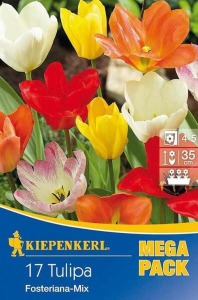 Tulipa Kaisertulpen Mix vegyes Fosteriana tulipán virághagymák MEGA PACK Virághagyma körmérete: 10/11 cm Növény várható magassága: 35 cm Javasolt ültetési ideje: szeptember-december Virágzás ideje: április-május Vágott virágnak is alkalmas Balkonládába is ültethetõ A Kiepenkerl 'Kaisertulpen Mix' tulipán virághagyma csomag különleges, nagy méretű tulipánokat tartalmaz