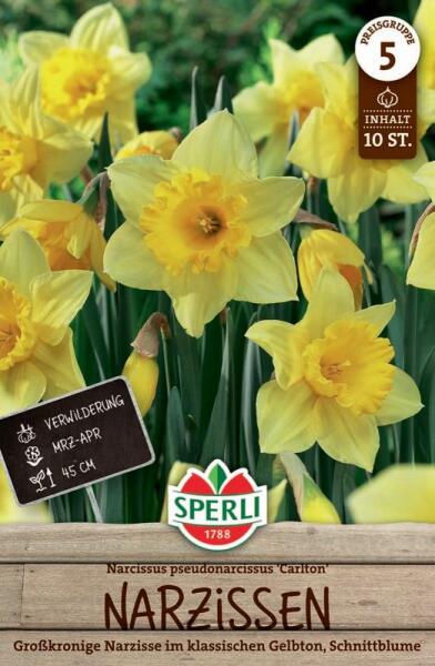 Großkronige Narzisse Carlton nagykoronájú nárcisz virághagyma Virághagyma körmérete: 12/14 cm Növény várható magassága: 20-40 cm Javasolt ültetési ideje: szeptember-december Virágzás ideje: március-április Vágott virágnak is alkalmas A nagykoronájú nárciszok lenyűgözõ, nagy méretű virágaikról ismertek, amelyek látványosan kiemelkednek a tavaszi kertben. Hosszú, sz
