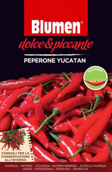 Peperone Yucatan, csípõs pepperóni chili paprika Közepes élettartalmú, a növény 50-60 cm magasra nõ meg. Piros datolya formájú termést hoz 5-6 cm hosszúakat, amelyek fürtökben lógnak. Alkalmas edényben történõ termesztésre is. Napigényes. Javasolt vetési hõmérséklet: 20/30 °C. Szabadföldbe, és fóliasátorba is vethetõ. 40 cm tõtávolságra, 1 cm mélyen vetendõ. Du