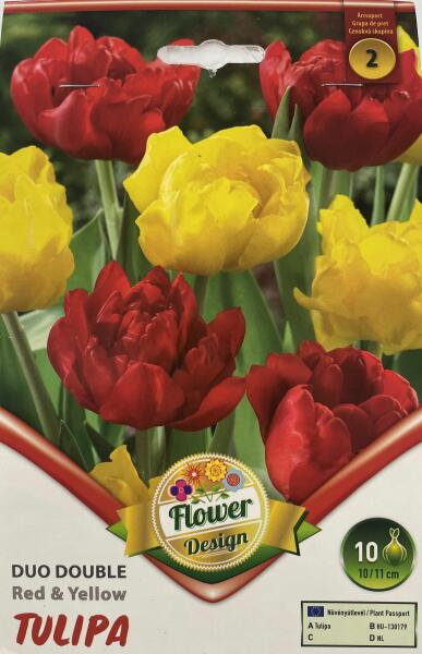 Tulipa Duo Double Red & Yellow teltvirágú tulipán virághagymák Virághagyma körmérete: 10/11 cm Javasolt ültetési ideje: IX. -XII. Virágzás ideje: IV Javasolt ültetési távolság: 10 cm Javasolt ültetési mélység kb. : 10 cm Növény várható magassága kb. : 30 cm Ezek a korai virágzású tulipánok már áprilisban nyílnak és különösen alkalmasak ágyások, virágszeg