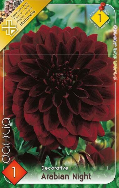 Dahlia Decorative Arabien Night dekoratív dália gumó 1' Javasolt ültetési ideje: III. -V. Virágzás ideje: VII. -X. Javasolt ültetési távolság: 60 cm Javasolt ültetési mélység kb. : 8 cm Növény várható magassága kb. : 110 cm Termesztett állományból származó növény. Származási hely: EU Kiültetés elõtt a gumókat - megjelölve, hogy melyik-melyik - virágzás segítõk