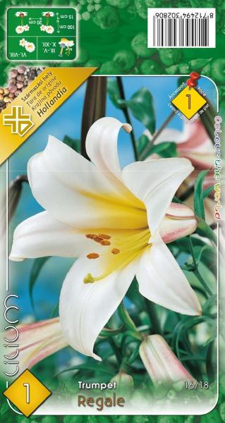 Regale trombitavirágú liliom Javasolt ültetési ideje: III. -V. vagy IX. -XII. Virágzás ideje: VI. -VIII. Javasolt ültetési távolság: 20 cm Javasolt ültetési mélység kb. : 15 cm Növény várható magassága kb. : 100 cm Termesztett állományból származó növény. Származási hely: EU A trombitavirágú liliom nagytermetű hagymás növény, amely évelõágyakba ültetve és vá