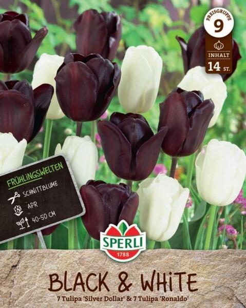 Frühlingsgarten Black and White kései egyszerű virágú tavaszi tulipán virághagyma keverék Növény várható magassága: 40-50 cm Javasolt ültetési ideje: szeptember-december Virágzás ideje: április Vágott virágnak is alkalmas Tartalma: 7 db "Silver Dollar" tulipán virághagyma 7 db "Ronaldo" tulipán virághagyma A kései egyszerű virágú tulipán egy kifinomult és elegáns vá