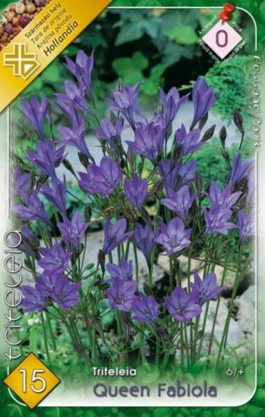 Triteleia Queen Fabiola csillaghagyma virághagymák Virághagyma körmérete: 6/+ cm Javasolt ültetési ideje: IX. -XII. Javasolt ültetési távolság: 10 cm Javasolt ültetési mélység: 8 cm Növény várható magassága: 35 cm Virágzás ideje: V. -VI. A sötétkék csillaghagyma õsszel és tavasszal is egyaránt ültethetõ csinos hagymás növény. Világosabb alapon liláskék csíkozá