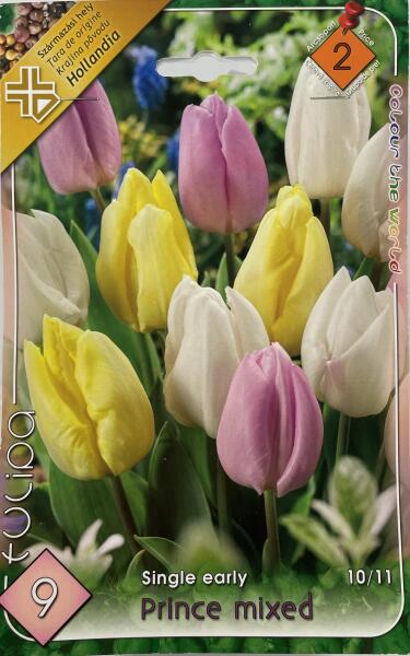 Tulipa Single early Prince mixed tulipán virághagymák Virághagyma körmérete: 10/11 cm Javasolt ültetési ideje: Szeptember - December Virágzás ideje: Április Javasolt ültetési távolság: 10 cm Javasolt ültetési mélység kb. : 10 cm Növény várható magassága kb. : 35 cm A korai, egyszerű tulipánok áprilisi virágzású, 25-30 cm szárhosszúságú tulipánfajták. Mutatós d