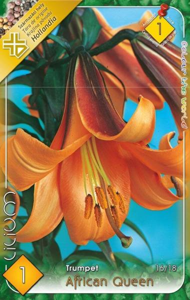 African Queen trombitavirágú liliom Javasolt ültetési ideje: III. -V. vagy IX. -XII. Virágzás ideje: VI. -VIII. Javasolt ültetési távolság: 20 cm Javasolt ültetési mélység kb. : 15 cm Növény várható magassága kb. : 120 cm Termesztett állományból származó növény. Származási hely: EU A trombitavirágú liliom nagytermetű hagymás növény, amely évelõágyakba ültetve