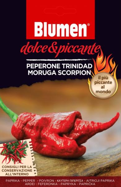 Peperone Trinidad Moruga Scorpion - "A világ legerõsebb chili paprikája" 2 MILLIÓ Scoville erõsségű. A nevét a skorpió farkára hasonlító formájáról kapta. A növény 80-90 cm magasra nõ meg. Forró környezetet kedveli az ideális növekedéshez. Napigényes. Javasolt vetési hõmérséklet: 20/30 °C. Szabadföldbe, és fóliasátorba is vethetõ. 40 cm tõtávolságra, 1 cm mély