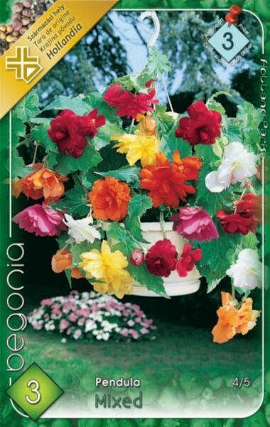 Begonia Pendula Mixed vegyes begónia gumók Javasolt ültetési ideje: IV. -V. Virágzás ideje: VII. -X. Javasolt ültetési távolság: 25 cm Javasolt ültetési mélység kb. : 5 cm Növény várható magassága kb. : 20 cm Termesztett állományból származó növény. Származási hely: EU A csüngõvirágú begónia az alacsony termetű (kb. 20 cm-es) növény virágait mintegy 30 cm hossz