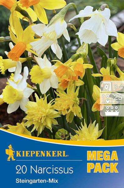 Narcissus Steingarten-Mix vegyes botanikai nárcisz virághagymák MEGA PACK Virághagyma körmérete: 10/+ cm Növény várható magassága: 25 cm Javasolt ültetési ideje: szeptember-december Virágzás ideje: április Balkonládába is ültethetõ Vegyes nárcisz virághagyma csomag, amely különbözõ nárciszfajtákat tartalmaz, élénk sárga és fehér virágokkal. Ezek a virágok gyöny