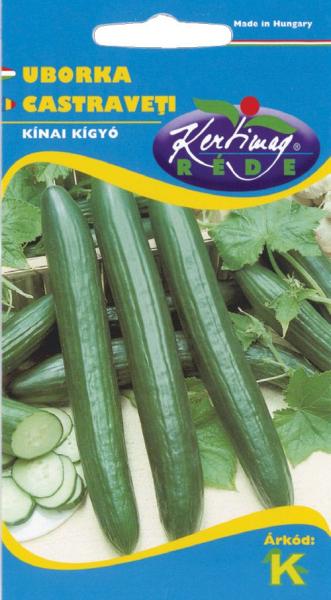 Kínai kígyó uborka 2 g Szabadföldi kígyóuborka. Hosszú tenyészidejű, nagyon erős növekedésű, kevert virágú házikerti fajta. Termése 35-40 cm hosszú rövid nyakkal, sötétzöld színű, sima héjú. Szabadföldi termesztésre ajánlott. Vetés: május-júniusban szabadföldbe, 2 cm mélyen. Vetőmagszükséglet: 5-6g/10 m 2 Térállás: 100x20cm sorba vetésnél vagy 60-80 cm-es