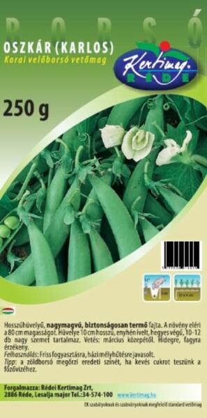 A Rédei Kertimag Velőborsó Oszkár (Carlos) 250g egy kiváló választás mindazok számára, akik szeretnék saját kertjükben termesztett, friss zöldborsót élvezni. Ez a hosszúhüvelyű, nagymagvú fajta akár 80 cm-es magasságot is elér, és 10 cm hosszú, enyhén ívelt, hegyes végű hüvelyeket produkál, melyek 10-12 darab nagy szemet tartalmaznak. A vetés ideális időpontja má